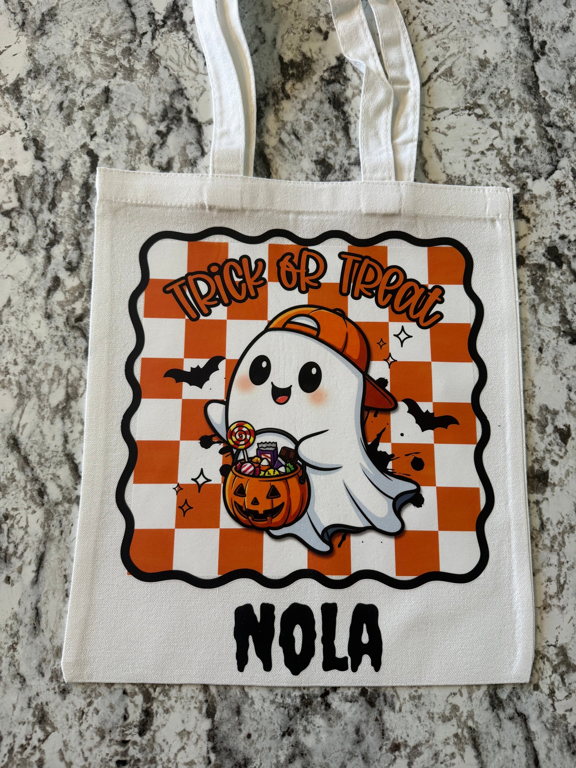 Fun trick or treat bags for your littles! Will come with their names listed along the bottom.