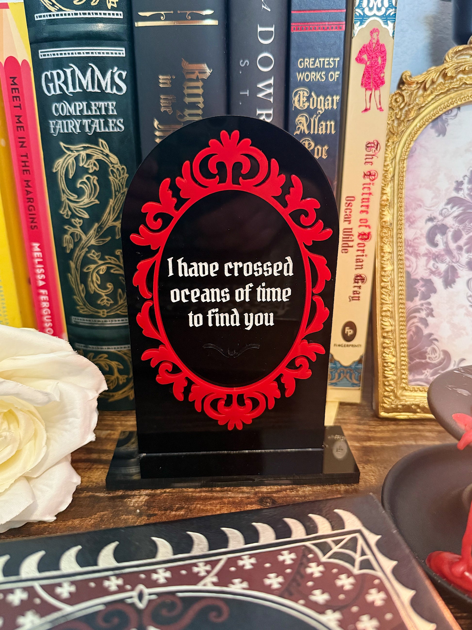 This Victorian goth style bookshelf sign can be customized to say what you’d like or can be purchased as is with the white shown. Text is engraved into black acrylic and paint filled white.
